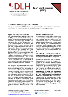 Das Infoblatt "Sport und Bewegung – ein Leitfaden" gibt eine Übersicht über den Nutzen, den Bewegung und Sport für die Menschen im Allgemeinen sowie insbesondere bei Krebserkrankten haben.